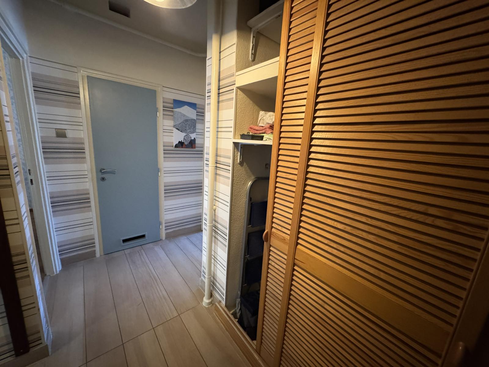 Balra, az utca felé tekintő konyha, mellette a kisebb szoba, és a mellékhelység. Szemben a fürdőszoba. Jobbra pedig az erkélyes, kerti nézetű szoba található.A közlekedőben egy praktikus gardróbszekrényt alakítottak ki.